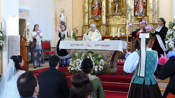 Bajo arcos florales y al son de la dulzaina, recibimos y acompañamos a los novios al altar.